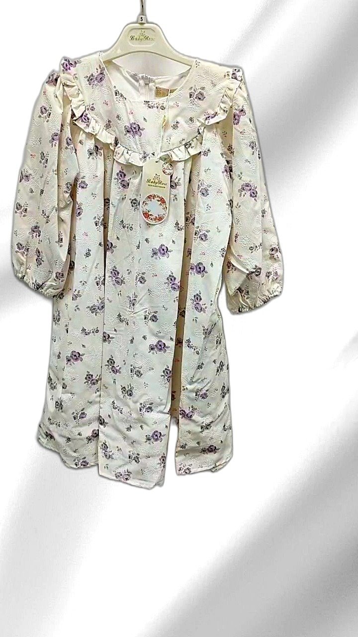 This delightful kids dress by BabyRose features a charming floral pattern in white and purple hues. Designed with ruffles around the neckline and long sleeves, it offers a touch of elegance and comfort. Ideal for special occasions, this dress is suitable for young girls aged around 5 years. The lightweight fabric ensures breathability, making it perfect for various festivities. The intricate floral design and classic color scheme provide a timeless appeal, allowing your little one to shine.