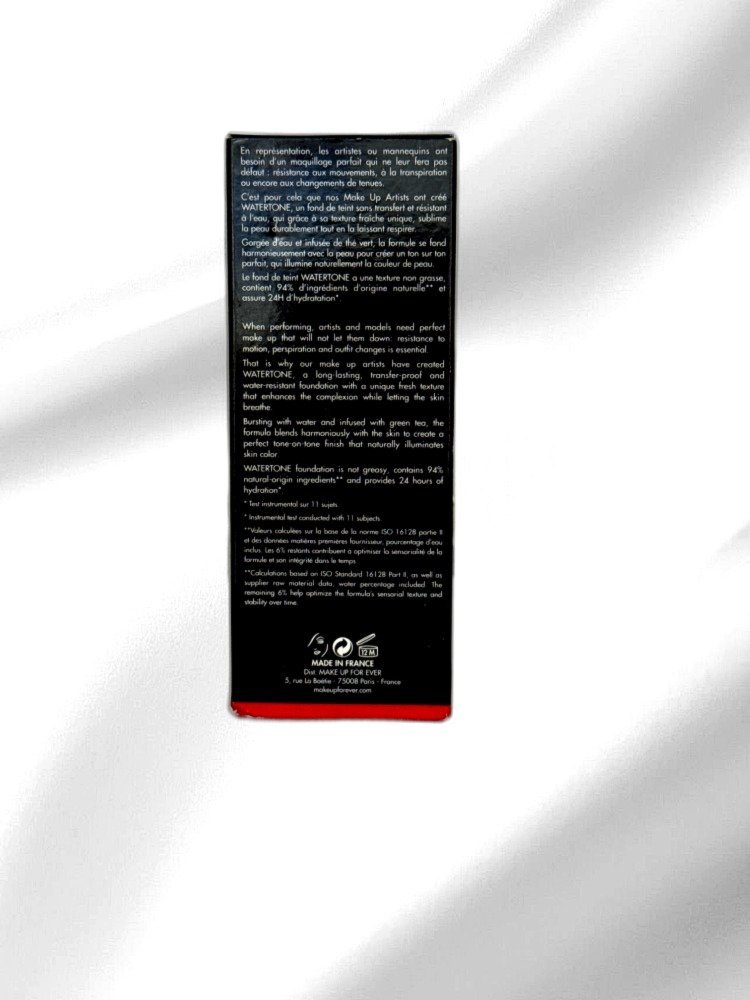 Introducing Make Up For Ever’s Watertone Foundation, the ultimate solution for a radiant and natural look. This skin-perfecting fresh foundation is specially designed to be transfer-proof, ensuring your makeup stays put throughout the day. With its water-based formula, Watertone provides a lightweight, breathable coverage that feels like a second skin, making it perfect for both face and body applications. Its refreshing texture not only enhances your natural beauty but also keeps your skin hydrated, allowing it to breathe freely.