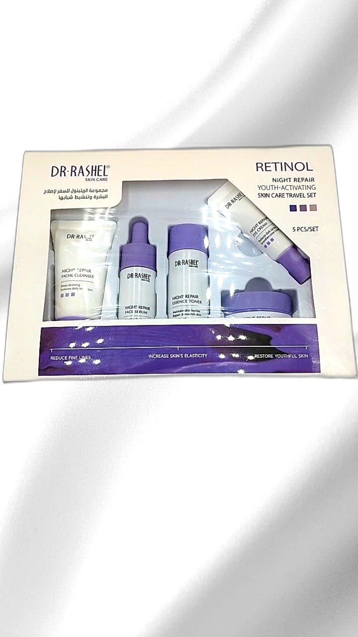 The Dr. Rashel Retinol Night Repair Youth-Activating Skin Care Travel Set includes five essential products designed to rejuvenate and repair skin overnight. The set features a facial cleanser, essence toner, face serum, regenerating cream, and eye cream, each packed with the anti-aging benefits of retinol. Ideal for travelers, this compact set helps reduce fine lines, increase skin elasticity, and restore youthful skin. Easy to use, it cleanses, tones, and nourishes the skin while you sleep, leaving it soft and radiant. Suitable for all skin types and helps combat signs of aging effectively.