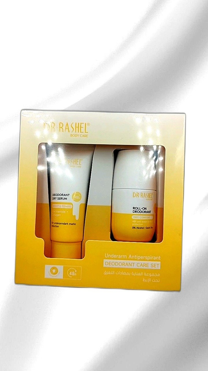 Experience the DR RASHEL Underarm Antiperspirant Deodorant Care Set, which includes a Bright & Firming Deodorant Dry Serum and a Dry Comfort Roll-On Deodorant. Formulated with niacinamide and collagen, the Dry Serum reduces dark spots and smoothens skin. The Roll-On Deodorant provides a powerful, fast-drying formula that ensures 48-hour protection against wetness and odor without leaving marks on clothes. Both products are designed for ultimate freshness and care for your underarm skin. Ideal for daily use, this set is perfect for maintaining a bright and firm underarm area.